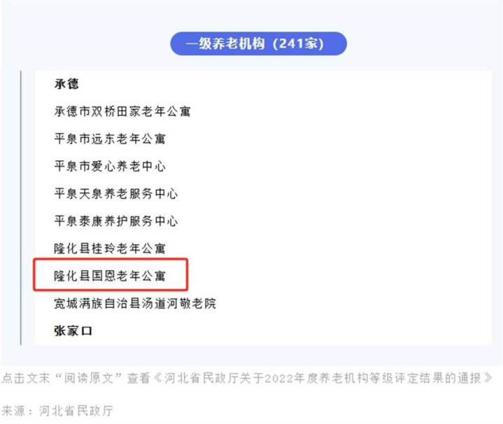 据极目新闻记者了解,发生事故的养老院为承德隆化县国恩老年公寓。公开信息显示,该老年公寓在2023年被河北省民政厅评为一级养老机构。